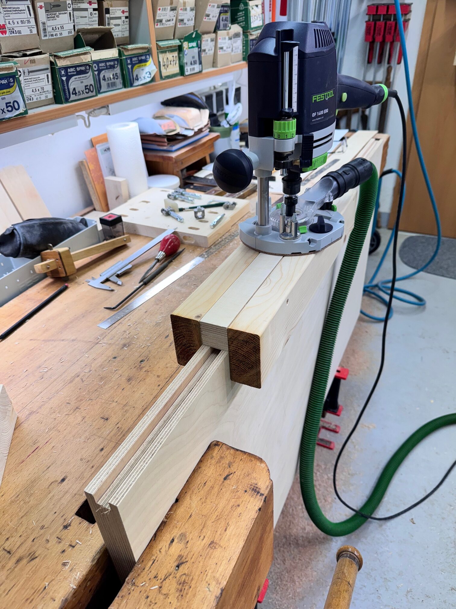 Für die beiden oberen Nuten habe ich eine Vorrichtung geplant, mit der man eine Oberfräse in axialer Richtung zum Fräsen Einspannen kann.